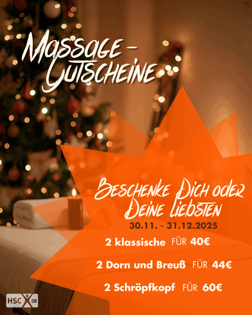 Noch auf der Suche nach einem sinnvollen Weihnachtsgeschenk? Im HSC-Sportwerk gibt es im Dezember die perfekten Gutscheine für alle, die Gesundheit, Fitness und Wohlbefinden verschenken oder sich selbst etwas Gutes tun möchten: Mitgliedschaftsgutscheine Gültig für alle Beitragsarten (Vollzeit, Teilzeit, Minijob) Für HSC-Mitglieder und Neumitglieder Preise direkt im Sportwerk erfragen Massage-Gutscheine für Entspannung 2 klassische Massagen […]