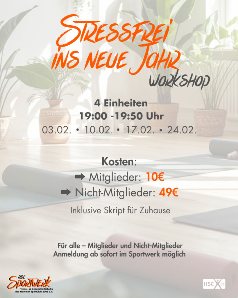 Workshop | Dienstags: 19:00 – 19:50 Uhr Start: 3. Februar 2026 Für alle – Mitglieder und Nicht-Mitglieder! Übungen und Tipps für mehr Entspannung Inklusive Skript für Zuhause 4 Einheiten für einen entspannten Start ins Jahr Kosten: Mitglieder: 10 € Nicht-Mitglieder: 49 € Offen für alle Sportwerk-Mitglieder (auch Teilzeit) und externe Teilnehmer! […]