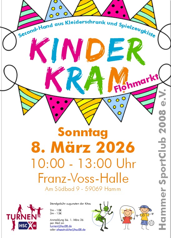 Kommt vorbei zum Kinder-Kram-Markt am 8. März! Hier findet ihr alles rund ums Kind: von Kleidung über Spielzeug bis hin zu Büchern. Sonntag, 8. März 2026 10:00 – 13:00 Uhr Franz-Voß-Halle (Am Südbad 9, Hamm) Infos für Verkäufer: Möchtet ihr selbst einen Stand machen? Die Anmeldung ist bis zum 1. März 2026 möglich. Anmeldung: Per […]