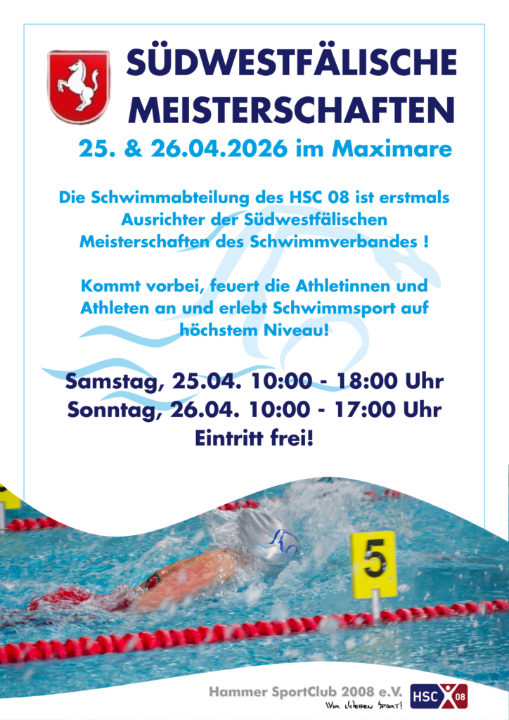 Kommt zu den Südwestfälischen Meisterschaften am 25. & 26. April im Maximare und erlebt Schwimmsport auf höchstem Niveau. Erstmals ausgerichtet vom HSC 08. Seid dabei und feuert die Athletinnen und Athleten an. Eintritt frei! Wir freuen uns auf Euch!