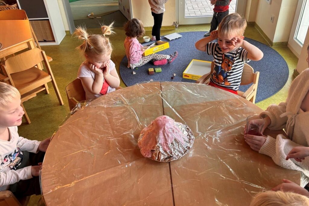Im Rahmen unseres Themas „Dinosaurier und Steinzeit“ haben wir uns auch mit Vulkanen beschäftigt. Die Kinder haben gelernt, dass es schon vor Millionen von Jahren Vulkane gab und dass sie eine wichtige Rolle in der Erdgeschichte gespielt haben. Passend dazu haben wir gemeinsam ein spannendes Vulkan-Experiment durchgeführt. Mit Backpulver, Essig, Wasser, Spülmittel und roter Lebensmittelfarbe haben wir einen sprudelnden Vulkanausbruch nachgestellt. […]