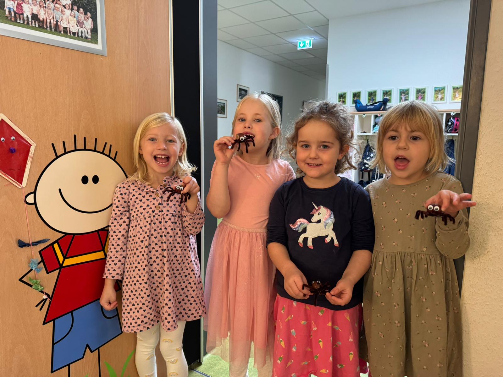 Die Wiesenstrolche haben Besuch bekommen. Nach und nach krabbelten immer mehr Spinnen auf dem Basteltisch herum. Aus den gesammelten Kastanien, braunen Pfeifenputzern und Wackelaugen bastelten