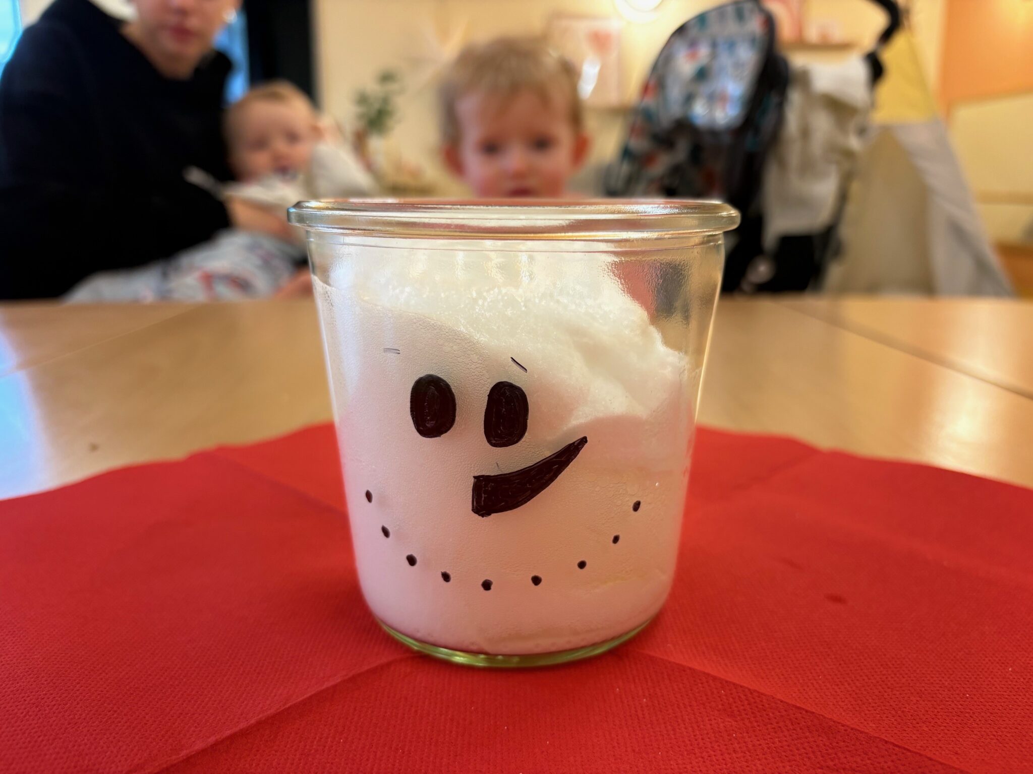 Dafür haben wir ein Glas mit einem Schneemanngesicht bemalt und anschließend mit Natron, Eiweiß und etwas Essig gefüllt. Kaum war der Essig im Glas, ging es auch schon los: Es begann zu schäumen und zu sprudeln – und unser Schneemann im Glas erwachte zum Leben!