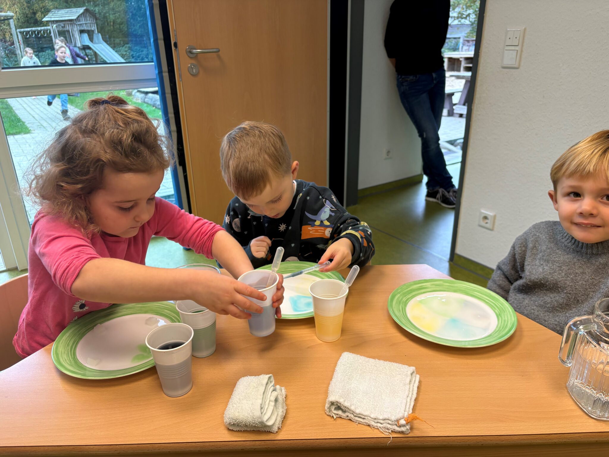 Mit Staunen beobachten die Kinder, wie sich die Farben durch den Zucker hindurchbewegen und dabei bunte Muster und Linien entstehen. So wurden aus einem einfachen Versuch ein kleines Kunstwerk und ganz nebenbei konnten die Kinder entdecken, wie sich Flüssigkeiten und Zucker verbinden.