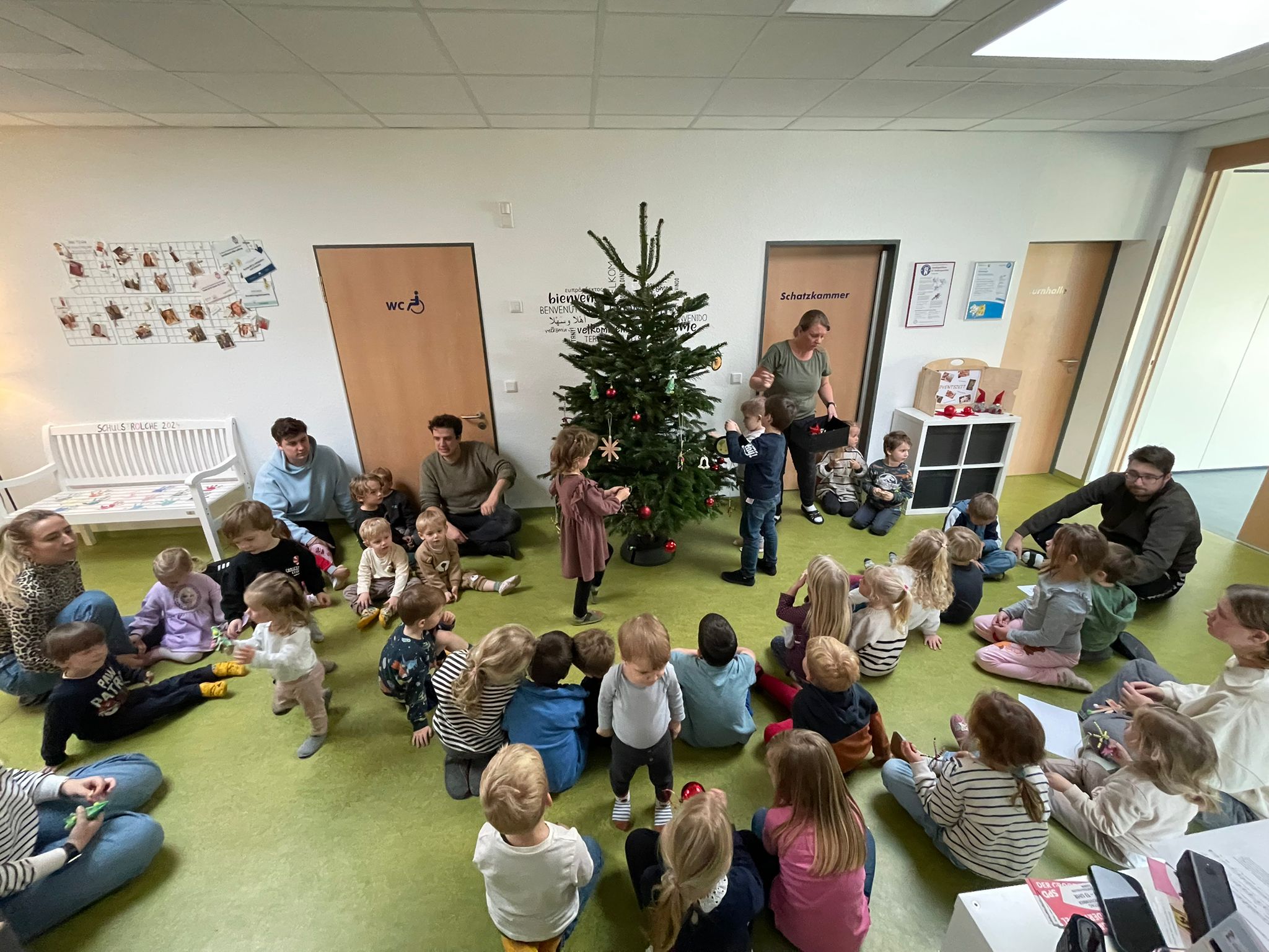Jeden Montag nach einem Adventssonntag treffen sich alle Ahsestrolche im Flur zum Adventssingen. Um den Tannenbaum herum nehmen die Kinder Platz und kommen zur Ruhe.