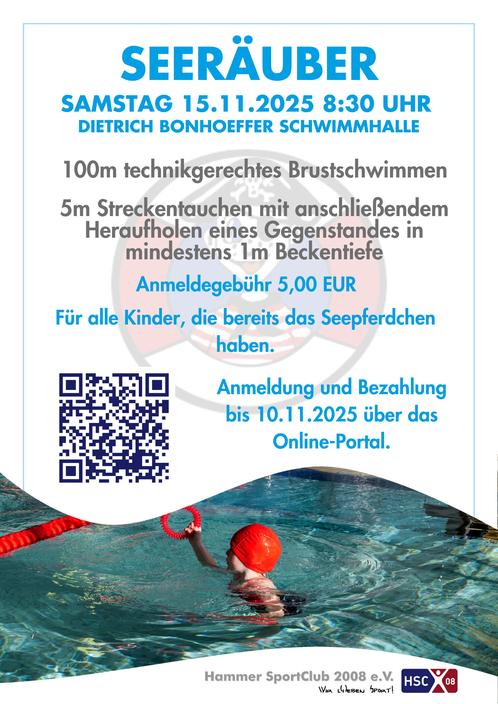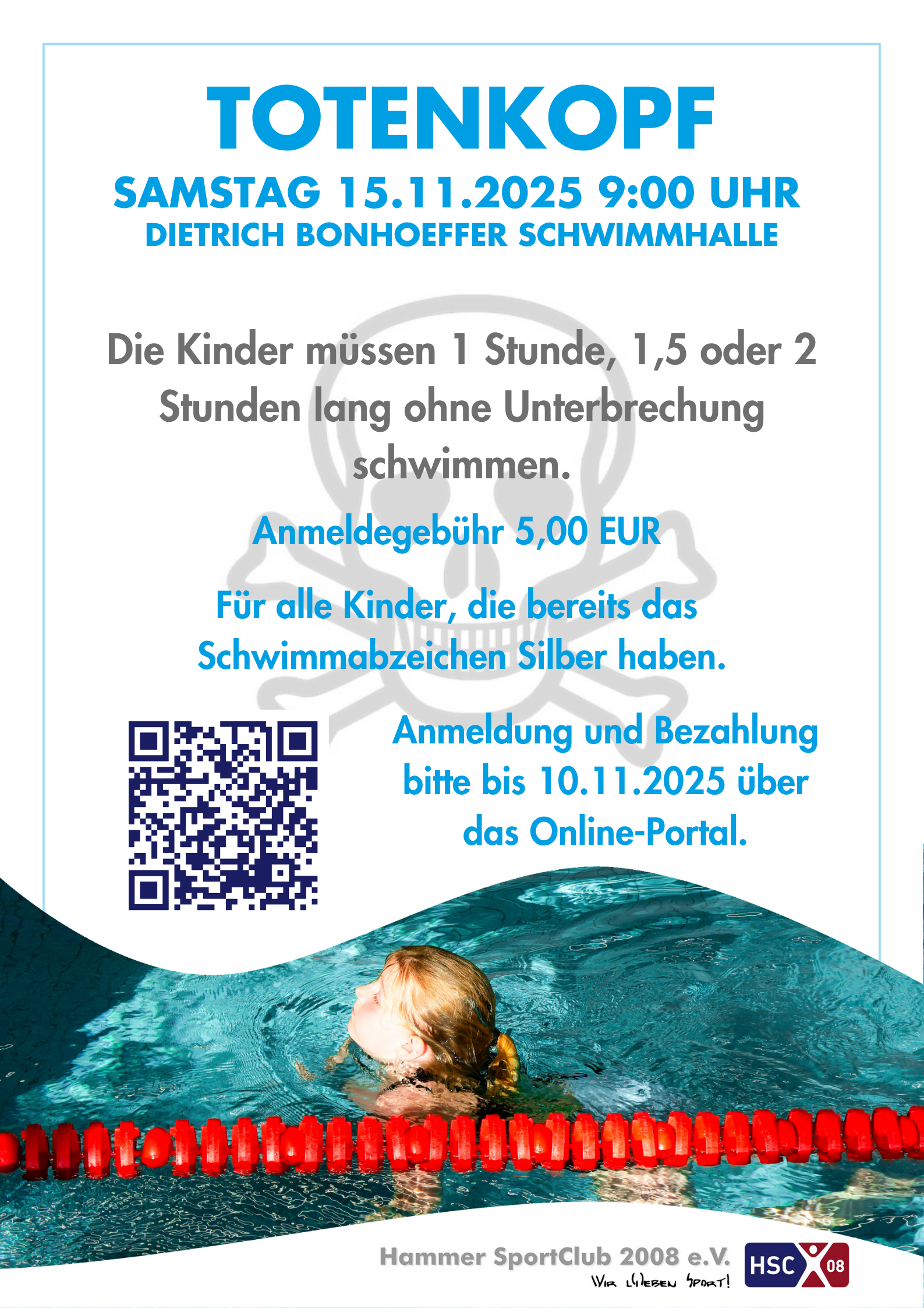 Für alle Kinder, die ihr Können zeigen wollen und das nächste Schwimmabzeichen erwerben möchten, wird am Samstag, den 15. November 2025, in der Dietrich-Bonhoeffer-Schwimmhalle wieder die Abnahme vom Seeräuber und Totenkopf Schwimmabzeichen angeboten.