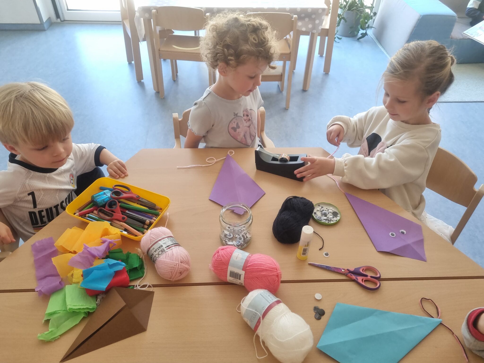 Später in der Woche wurden die Wasserstrolche herbstlich kreativ und haben Lenkdrachen für das Fenster und die Gruppentür gebastelt.