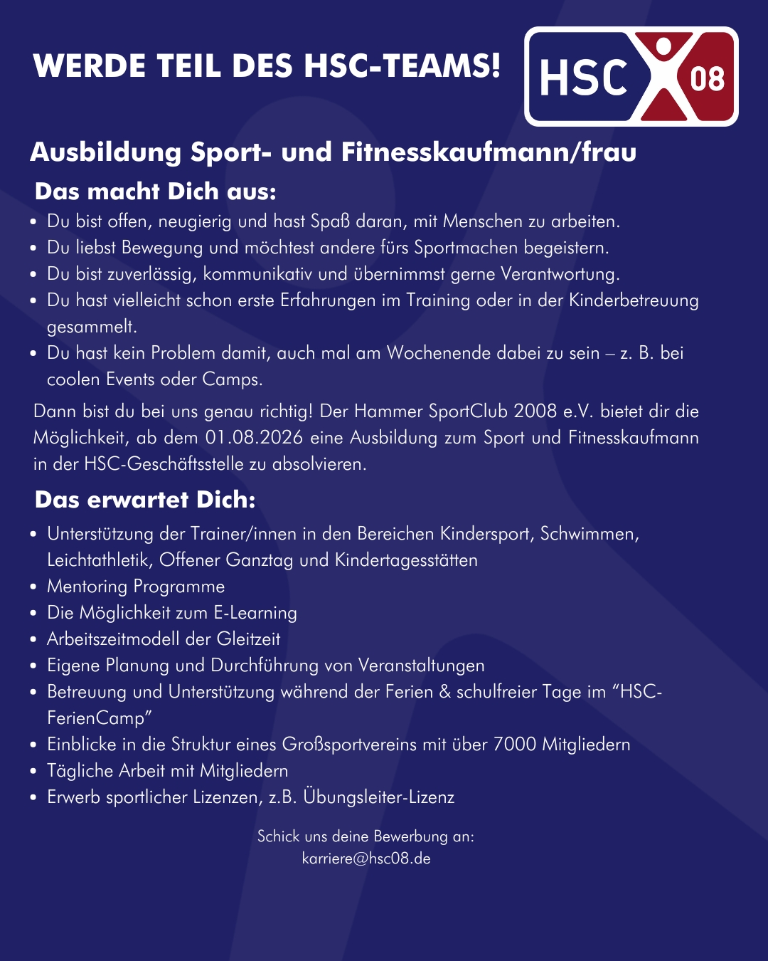 Bewirb dich jetzt unter karriere@hsc08.de und starte mit uns durch!